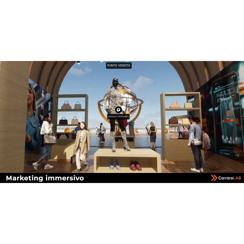 Per l’indirizzo di “Amministrazione, finanza e marketing”, il laboratorio sviluppa una dei filoni più avanzati ed emergenti del marketing, adottando tecnologie di realtà virtuale e aumentata che offrono un elevato livello di coinvolgimento dei clienti. Il Marketing Immersivo comprende tour virtuali di aziende e territori, presentazioni di prodotti in realtà aumentata, video a 360 gradi di esperienze ed eventi. Nel laboratorio vengono applicati format avanzati con riprese virtuali realizzate anche in outdoor learning, inizialmente col supporto di una troupe specializzata, poi con riprese effettuate direttamente da studenti e docenti. Il laboratorio può essere adattato anche per gli Istituti professionali dell’indirizzo “servizi commerciali” con opzione “promozione commerciale e pubblicitaria”.
