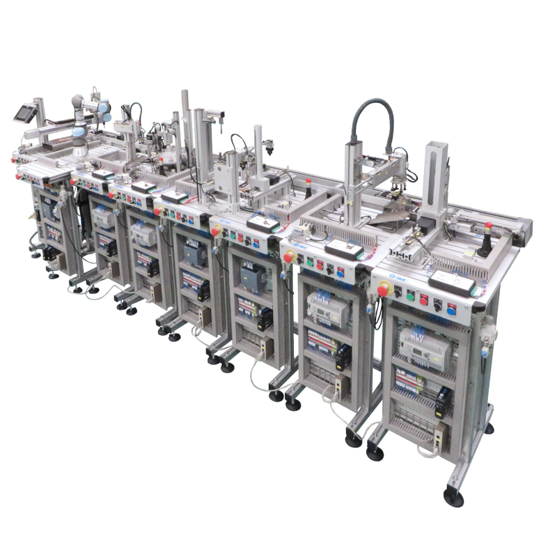 Elementi comuni a tutte le stazioni: alimentatore, struttura in alluminio anodizzato, tastiera di controllo, blocco elettrovalvole, etichette per cavi, morsetti di collegamento elettrico, regolatori di velocità, unità di trattamento aria, PLC di controllo*, manuale utente e manuale di istruzioni.